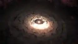 Oph-IRS 48 is a star surrounded by an extraordinary protoplanetary disk, about 444 light-years from Earth in the constellation of Ophiuchus.[3] The disk has revolutionized the view of planet formation in astronomy. Studies have shown that the millimeter dust particles are gathered in a crescent shape, while the gas (traced by CO molecules) and small dust grains follow a full disk ring structure .[4][5][6] The centimeter grains are even more concentrated inside the crescent.[7] This structure is consistent with theoretical predictions of dust trapping. Also the chemical composition has been studied, with molecules like H2CO being present.[8] The dust trap is thought to be conducting the process of planet formation in this young system.