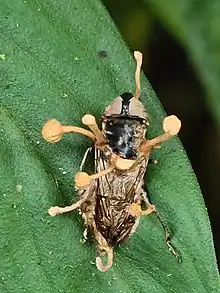 Other entomopathogenic fungi manipulate their hosts by making the fly look for the part of the plant where the stem is, and then the fly hangs itself by its legs. This hanging behavior seems to help the fungus grow and develop. O. dipterigena manipulates its host to land on a leaf without needing to hang itself. In this particular species, once the fly dies, a part of the fungus grows out from inside the insect through its head, resembling its antennae.[2] The stroma of O. dipterigena is yellow.