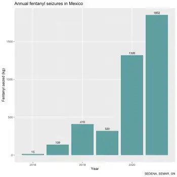 According to the United States Drug Enforcement Agency in 2023, China continued to be the primary source of fentanyl being imported into the United States, killing over 100 Americans every day.[121] Over a two-year period, close to $800 million worth of fentanyl pills were illegally sold online to the US by Chinese distributors.[122][123] The drug is usually manufactured in China, then shipped to Mexico, where it is processed and packaged, which is then smuggled into the US by drug cartels.[124] A large amount is also purchased online and shipped through the US Postal Service.[125] It can also be purchased directly from China, which has become a major manufacturer of various synthetic drugs illegal in the US.[126] AP reporters found multiple sellers in China willing to ship carfentanyl, an elephant tranquilizer that is so potent it has been considered a chemical weapon. The sellers also offered advice on how to evade screening by US authorities.[127] According to Assistant US Attorney, Matt Cronin: