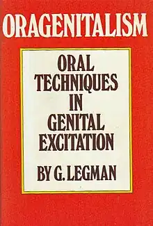 Oragenitalism is a book by the American folklorist Gershon Legman, published by the Julian Press in 1969. The book describes various types of oral sex. The book is intended as "instruction manual, conduct guide, and household advice book".[1] The author claimed that it was the earliest book of its kind on the subject, and for a long time the only one.[2] Its contents are divided into four sections: "Cunnilinctus" written under the pen-name Roger-Maxe de la Glannege (an anagram of his real name) and published by Jacob Brussel of New York in 1940;[3][4] the three remaining sections "Fellatio", "Irrumation", and "Sixty-Nine" were not published until 1969.[2]