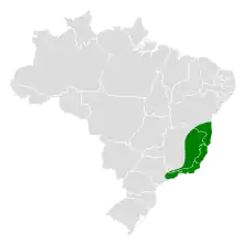 The orange-eyed thornbird is found in southeastern Brazil from southern Bahia south to northeastern São Paulo state. Within the Atlantic Forest biome it primarily inhabits humid lowland and montane evergreen forest and secondary forest but is also found near small marshes, along watercourses in woodlands, and in Eucalyptus plantations and urban areas. In elevation it mostly ranges from near sea level to 850 m (2,800 ft) but in the south of its range occurs locally as high as 1,700 m (5,600 ft).[6][7]