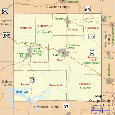 - ↑ "Orange County IN – County Subdivision and Place. GCT-PH1. Population, Housing Units, Area, and Density: 2000". US Census Bureau. Archived from the original on February 16, 2020. Retrieved February 9, 2011.