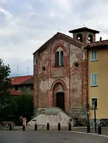 The plain Gothic-style brick two-story structure is located in the town center, next to the parish church of San Vito Martire. Construction took place in 1369, commissioned by Stefano Porro, an ambassador to the court of Bernabò and Galeazzo Visconti, who was made a palatine count by the Holy Roman Emperor Charles IV in 1368. The outside appears dilapidated. The entrance to the single nave is through a stairwell dipping below the right of the façade, above is a mullioned window with an ogival window frame. Despite restoration in the 1930s and 1960s, the frescoes are threatened by humidity.[1]