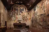 The oratory is best known for its late Gothic style fresco cycle (1416) by the brothers Lorenzo and Jacopo Salimbeni. The subjects include a Madonna dell’Umiltà and a Crucifixion, In addition the oratory has scenes from the life of John the Baptist such as: the Annunciation of Birth; his Baptism of Jesus, Career in Baptizing, and Sermons of St John.[1]