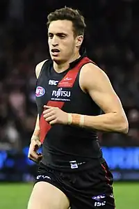He made his debut against Richmond in round 20, 2014[7] and was dropped for the following round but regained his spot in round 22 against the Gold Coast, replacing Dyson Heppell who missed the game due to a broken hand. In the final round of the 2015 season, he was rewarded with a nomination for the AFL Rising Star where he recorded 27 disposals and five marks in the Bombers' three-point victory over Collingwood.[8]
