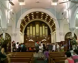 The church has one of the few working pipe organs in Singapore.[7] The first organ was installed in 1861, and the current one is the third to be constructed in the church. This organ was built in 1962 by J. W. Walker & Sons based on the 1926 two-manual and pedal-tracker organ by William Hill & Sons/Norman and Beard. Its action was electrified in 1987.[8]