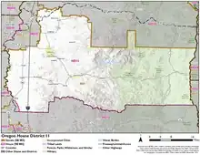 District 11 of the Oregon House of Representatives is one of 60 House legislative districts in the state of Oregon. As of 2021, the boundary for the district is located mostly within eastern Linn County with a small portion of southern Marion County and contains Lebanon, Sweet Home, and Brownsville. The current representative for the district is Republican Jami Cate of Lebanon.[1][2]