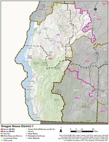 District 1 of the Oregon House of Representatives is one of 60 House legislative districts in the state of Oregon. As of 2021, the boundary for the district includes all of Curry County and portions of Coos and Douglas counties. The current representative for the district is Republican Court Boice of Gold Beach.[1][2]