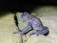 Oreolalax rhodostigmatus (Guizhou lazy toad or red-spotted toothed toad) is a species of amphibian in the family Megophryidae. It is endemic to central and south-central China where it can be found in Hubei, Sichuan, Guizhou, and Hunan provinces.[2] While its distribution is relatively wide, it is known from only few locations. Its natural habitats are limestone caves in forested habitats. Breeding takes place in springs and stream pools inside the limestone caves. It is threatened by habitat loss and locally by collection for food (tadpoles).[1]