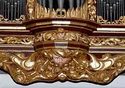 The relatively broad cases of the Hauptwerk and Rückpositiv are both divided into five parts and are matching in shape. In both cases, the elevated polygonal central tower is connected to the lateral pointed towers by two-storey pipe-flats in which dummy pipes are used (as in the Schnitger organ in Nieuw Scheemda). The pointed side towers and flats of the two cases are respectively united under a common cornice in composite style. Elaborately designed mechanisms connect to the narrower lower case with the console.[7] The richly decorated cornices, stands and friezes of the facade echo the appearance of the previous instrument, or perhaps parts of the old ornamentation were re-used.[8] The new carving was created by the Hamburg sculptor Christian Precht.[9] The detail of the pipe-shades features floral elements exclusively in the main case, but the Rückpositiv adds flowers, fruits, grimaces, stylized animal heads and – in the lower part of the Rückpositiv – three angel heads.[10]