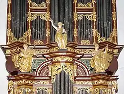 During the French occupation at the beginning of the 19th century, the monastery church in Hamburg served as a magazine. The organ was dismantled and stored in 1813 by Joachim Wilhelm Geycke; the Church was demolished in 1829, and later the monastery also. The organ was sold to Cappel by the Petrikirche in Hamburg for 600 Reichstaler.[13] After a fire in 1810 a new church had been built in Cappel (1815–1816), but the community could not afford a new organ. A delegation from Cappel traveled to Hamburg on 16 June 1816 to collect the organ. Geycke and Johann Heinrich Wohlien packed the organ in wooden boxes, which were transported from Hamburg to Cuxhaven by ship.[14] On June 29, 1816, the transfer of the organ was completed. Johann Georg Wilhelm Wilhelmy (Stade) signed a contract in which he undertook to rebuild the organ for 385 Reichstaler and set it up. The main case had to be shortened. For the flame ornaments in front of the feet of the front pipes in the middle tower of the Rückpositivs, which represent a stylistically strikingly foreign element, Wilhelmy used broken parts of carved angel wings, which are still missing from the angels on the Rückpositiv.[15] The round segments next to the middle tower of the Rückpositiv are probably attributable to Wilhelmy. In addition, Wilhelmy was commissioned to install a Zimbelstern. Due to the lower ceiling height compared to Hamburg, the Christ and angel figures could no longer be placed on the main case and were instead used on the pulpit and altar. Since this alteration, John the Baptist, the middle figure on the Rückpositiv, no longer points with his index finger to the Christ figure, but into a void.[8] In 1890, the Stade organ builder Johann Hinrich Röver replaced Schnitger's bellows with three large wedge bellows, resembling those of Schnitger in construction, providing a comparable breathing wind supply.[6] Until 1927, the instrument was maintained by various organ workshops from Stade, without interfering with its historic substance.
