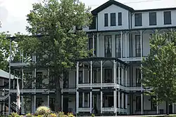 Orkney Springs Hotel is a historic resort spa complex located at Orkney Springs, Shenandoah County, Virginia. The oldest building, known as Maryland House, was built in 1853, and is a two-story, rectangular stuccoed frame building. It is faced on all sides by double galleries. The main hotel building, known as Virginia House, was built between 1873 and 1876. It is a four-story, stuccoed frame, H-shaped building measuring 100 feet by 165 feet and features a three-story verandah. The hotel contains 175 bedrooms. The remaining contributing resources are the three-story Pennsylvania House (1867), seven identical two-story, six-room, hipped roof cottages, and a small columned pavilion located next to the mineral springs.[3]