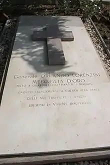 The Battle of Keren lasted from 5 February to 1 April 1941, and was the longest and the bloodiest of the East African Campaign. General Lorenzini was killed during the battle at 15:00 on 17 March 1941, by a grenade splinter. He was buried in the Asmara War Cemetery two days later, and posthumously awarded the Gold Medal of Military Valour.[1]