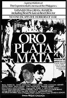 Oro, Plata, Mata (Spanish: Gold, Silver, Death) is a 1982 Philippine historical war drama film co-written and directed by Peque Gallaga. The screenplay written and adapted by José Javier Reyes was based on the story by Gallaga, along with Mario Taguiwalo and Conchita Castillo. The film is considered to be Gallaga's most significant contribution to the Philippine cinema. Set in the Philippine island of Negros during World War II, it tells the story of how two hacendero families cope with the changes brought about by the war.[2] In translation, the movie is also known either as "Gold, Silver, Bad Luck" or "Gold, Silver, Death."[3]