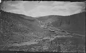 Gold was discovered in the area in late 1859, during the Pike's Peak Gold Rush. However the initial discovery, where California Gulch empties into the Arkansas River, was not rich enough to cause excitement. On 26 April 1860, Abe Lee made a rich discovery of placer gold on California Gulch six miles east of the Arkansas River, and Oro City was founded at the new diggings.[2][3] By July 1860, the town and surrounding area had a population of 10,000. An estimated $2 million in gold was taken out the first summer from California Gulch and nearby Iowa Gulch, but within a few years the richest part of the placers had been exhausted, and the population of Oro City was several hundred. Many claims (each measuring 100 feet along the stream) were consolidated, and worked by ground sluicing. A ditch was dug in 1877 to provide water for hydraulic mining, but the hydraulic mining was reported to be unsuccessful.[4]