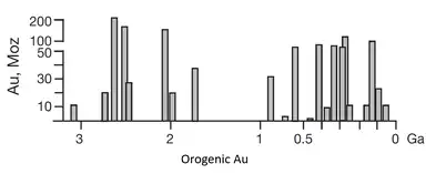 Amalgamation of disrupted continental masses to form new supercontinents, known as Wilson cycles, play a key role in the formation of deposits, by initiating major regional change of the geochemical, mineralogical and structural nature of the lithosphere.[6] Orogenic gold deposits were only formed in certain time slices of the Earth's history.[7][8] Orogenic gold deposits are mainly concentrated in three epochs of Earth history: (1) Neoarchean 2.8–2.5 Ga, (2) Paleoproterozoic 2.1–1.8 Ga and, (3) Phanerozoic 0.500–0.05 Ga. With an absence in the period 1.80–0.8 Ga,[9][7] referred to as a period of general minimum ore-forming activity.[8] The same temporal occurrence is documented for conglomerate-hosted deposits.[10] The time-bound nature of many mineral deposits reflects the break-up or formation of supercontinents, which most likely also applies for orogenic gold deposits.[7]