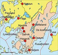 On 1 January 2020, the neighboring municipalities of Os and Fusa were merged to form the new Bjørnafjorden Municipality.[8]