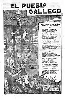 In the 1920s, members of Irmandades were involved in theater and founded Escola Dramática Galega, with notable playwrights such as Cotarelo Valledor and Vicente Risco.[39] Noriega Varela and Cabanillas bridged the gap between 19th century and the avant-gardes. Cabanillas assimilates the poetry of Curros, Rosalía de Castro and Pondal, also taking modernist elements. Rafael Dieste was the most prominent author in the Generation of 25, and the scenography was diverse, with surrealist and symbolist elements.[40] Lorca founded La Barraca in the early 1930s where Lugrís and Ernesto G. da Cal participated in the scenography. Lorca wrote Six poems in Galician in 1935 as a result of his friendship with Galician artists.[41]