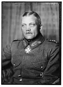In April 1913, von Watter took over the command of the 10th Brigade of Field Artillery, which he kept until 3 March 1915. With that force, General von Watter took part in the early fighting of World War I in France. Subsequently, he took over the 54th Infantry Division, which he commanded until 5 March 1918. The division was initially also deployed in France, but it was later sent to fight on the eastern front by the River Narew, and from September 1915, he was again at the western front. On 23 December 1917, he was awarded the Pour le Mérite for military bravery.[1] Until 11 November 1918, he was commander of the XXVI Reserve Corps. On 3 November 1918, a few days before the end of the war, he was awarded the oak leaves of the "Pour le Mérite" (signifying a second award).[2]