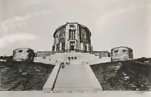 The monument was designed by it:Ghino Venturi, cofounder of the Sindacato Fascista Architetti. Proposed in 1932 and completed in 1938, it consists of a round tower above a flight of steps, with three lower bastions (Prelli, Montanari and Langoris) connected by underground passages.[3][4] The names of the identified dead line the walls of the internal circular chambers. In the central tower is a tall black marble cross; in the crypt below is the tomb of General it:Achille Papa and of twelve other holders of the Gold Medal of Military Valour. A bell named “Chiara” in the campanile sounds at sunset.[5][6] The central tower was originally open to the sky but the structure suffered from water penetration. A plexiglass roof structure was added, and in 2016 this was replaced with a permanent polycarbonate covering.[7]