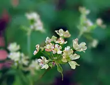 The green leaves have blades up to 20 centimeters long which are divided into toothed or lobed leaflets. The blade is borne on a long petiole.