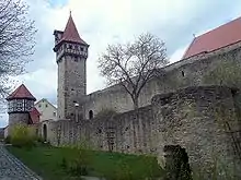 The outer walls are abutted by the partially preserved city fortification walls. The fortress church was accessible from the southeast corner through a round-arched entrance gate with a portcullis. In front of it was a fortification ditch, which enclosed the entire complex. In later years, the moat was filled in and another entrance from the outside was broken through the northern parts of the wall.[14]