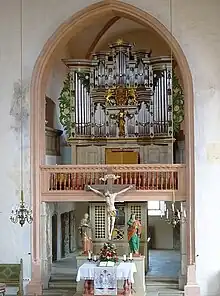 The organ in the choir room was built by Johann Ernst Döring in 1738 and stood in the extended west gallery from 1894 to 1975. When it was moved back to the choir loft in 1975, two side tower structures from 1894 were removed from the casing. The organ has two manuals and pedal with a total of 37 stops.[18] The case was repainted with the former color scheme and gilded. The organ was renovated by master organ builder Otto Hoffmann and Sons during the relocation. In the center is the ducal Saxon coat of arms with two gilded lions as coat of arms holders and above it the Zimbelstern. Below it is a trombone angel with movable arms, which was newly gilded during the renovation. The two large foliate vine surrounds were also newly carved.[4][19] A special feature is that when the Trompete 8' register in the Hauptwerk is operated, a mechanism is set in motion by which the angelic figure below the escutcheon puts the Trumpet to its mouth. The choir organ can also be played from the organ.[20]