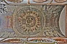 The large wooden barrel vault was decorated in 1619 by Nicolaus Storant of Meiningen with a ceiling painting, painted directly on the wood,[4] showing the heavenly throne of God as described in Revelation, chapters 4 and 5. Also from 1619 is a stone offertory box by Hans Markert.[4] On the northern long side and on the rear side are two seated galleries, one above the other, aligned with the pulpit with the four evangelists. The church interior, including the galleries, has a seating capacity of 1000.[16] The main entrance of the church on the south side from 1616 is splendidly decorated in Renaissance style. The east portal, also in Renaissance style with an obelisk, dates from 1615. On the south wall, Christian scenes in gray painting are arranged around the windows, showing God's love, faithfulness and care, Cain and Abel, David, and Goliath. On the walls are tombstones, which were rearranged between 1961 and 1975. A Baron von Stein is buried in the crypt under the choir.