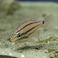 This species reaches about 14 centimeters long. The male and female look alike. The body is pinkish or brownish with four brown lines reaching nearly from head to tail. There is a black spot at the base of the tail.[2] The fish grows until it reaches 3 years of age, and it lives to a maximum age of about 7 years.