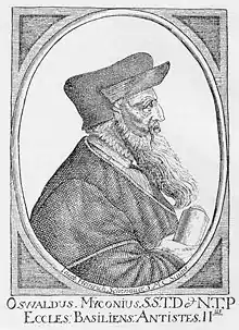 - 1 2 3 One or more of the preceding sentences incorporates text from a publication now in the public domain: Gordon, Alexander (1911). "Myconius, Oswald". In Chisholm, Hugh (ed.). Encyclopædia Britannica. Vol. 19 (11th ed.). Cambridge University Press. p. 110.