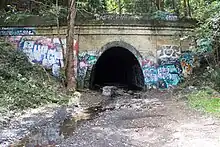 This is a disused concrete and brick arched 1824m long single track tunnel. The tunnel originally had a sandstone dish drain running through it, covered by large sandstone slabs, however much of the sandstone has been removed. The track bed and drain are estimated to be approximately 1.3 m below the current surface. The 1891 brick vent shaft is located halfway along the length of the tunnel.[4]