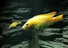 The Otjikoto tilapia (Tilapia guinasana) is a critically endangered species of cichlid fish endemic to Namibia where it was originally only found in Lake Guinas.[1][2] This very small sinkhole lake contains quite clear water that generally ranges between 18–25 °C (64–77 °F) depending on season,[3] and the Otjikoto tilapia has been seen down to depths of 67 m (220 ft).[1] Despite deriving its common name from the nearby Lake Otjikoto, it in not native to that lake, rather being an introduced species.[1] It is rare in the aquarium trade[4] and also kept in garden ponds in southern Africa.[3]