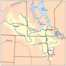 The Otter Tail River (Ojibwe: Nigigwaanowe-ziibi) is a 192-mile-long (309 km)[3] river in the west-central portion of the U.S. state of Minnesota. It begins in Becker County, 40 miles (64 km) southwest of Bemidji. It then flows through a number of lakes and cities in Minnesota, including Many Point Lake, Chippewa Lake, Height of Land Lake, Frazee, the Pine lakes, Rush Lake, Otter Tail Lake and Ottertail, West Lost Lake, Fergus Falls, and Orwell Lake.[2]