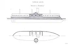 In the aftermath of the Crimean War, where an entire Ottoman squadron was destroyed by a Russian fleet at the Battle of Sinop, the Ottoman Empire began a small naval construction program, limited primarily by the chronically weak Ottoman economy. The design for Asar-i Tevfik was based on contemporary French warships like the Colbert-class ironclads, although significantly reduced in size.[1] The designers adopted a two-story arrangement of the main battery, which allowed for a shorter hull and in turn provided for a more maneuverable vessel.[2]