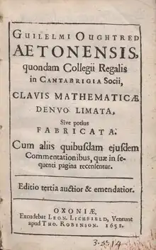 - ↑ G.[W.] Oughtred, Clavis Mathematica Denuo Limata, sive potius Fabricata (Londini, Excudebat Thomas Harper, sumptibus Thome Whitakeri, apud quem venales sunt in Cœmiterio D. Pauli, 1648); Full page views at Google.