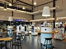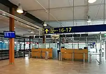 The old terminal of the airport was demolished in 2005 for more apron space and a major extension of the main terminal was completed in September 2011.[5] Four new jetbridge gates (gates 13–16) were constructed and the main terminal was expanded by 4,300 square metres (46,000 sq ft), raising the capacity of the airport to 1.5 million passengers per year. The terminal has three cafes, one before security and two in the gate area which also has a bar "Oluthuone Toppila" and a duty-free shop. There's also a designated smoking area and a grand piano that can be played by visitors.[6]