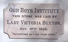 A plaque on the facade of the building commemorates the role played by Lady Victoria Buxton, the wife of the South Australian Governor, Sir Thomas Buxton. Lady Buxton, who lived in Adelaide between 1895 and 1898, was a Christian philanthropist who supported the Mothers' Union and YWCA.[10]