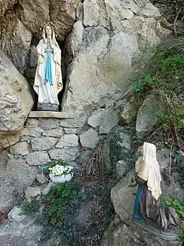 Heiligenkreuz lies on the Via Sacra pilgrimage route from Vienna to Austria's national Marian shrine Mariazell, and has always been a stopping point of many pilgrims.[1] The Cistercians of Heiligenkreuz Abbey say about the veneration of Mary, the Mother of God: "Where Mary is worshiped and prayed to, faith takes root and becomes alive and strong. Where Mary is loved, the Church is loved".[3] That is why a special place for pilgrims – the Cave of Our Lady of Lourdes – was created in the immediate vicinity of Heiligenkreuz Abbey. This Marian grotto was built in the summer of 2017 in a natural rock next to the Sattelbach stream, near the medieval granary, and was solemnly consecrated on the eve of the Assumption of Mary (14 August) by the Apostolic Nuncio in Austria, archbishop Peter Stephan Zurbriggen.[1] One statue of the Madonna of Lourdes from the beginning of the 20th century, a gift to the Heiligenkreuz Abbey, has been renovated and placed in a natural hollow of the rock, with an altar cut from the same stone and placed in front of it.[2] Since August 2020, a small statue of Saint Bernadette Soubirous, donated by an unidentified benefactor, has also been part of the Grotto of Our Lady of Lourdes in Heiligenkreuz: the abbot of Lilienfeld Abbey Pius Martin Maurer blessed it during the great candlelight procession on 14 August 2020.[4]