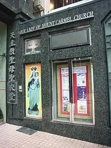 Our Lady of Mount Carmel Church (Chinese: 聖母聖衣堂) is a Roman Catholic church in the Diocese of Hong Kong. It is located in the Wanchai district at 1 Star Street.[1] The church is unique being located within a private multi-storey residential building, rather than a stand-alone structure.[2] The current parish priest is Rev. Thomas Law Kwok-Fai.