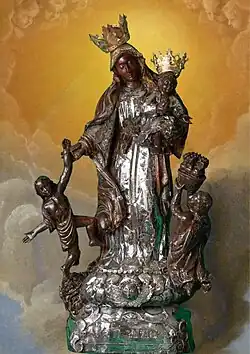 The original, 18th-century image of Our Lady of Salvation reflects her role, according to Catholic doctrine, as Co-Redemptrix. The Virgin is portrayed as carrying the Christ Child in her left arm, while her right arm grasps a man[note 1] by the wrist as he is about to fall into a gaping Hellmouth. An angel kneels at the foot of the Virgin, offering a basket of burning hearts to Christ, who holds a burning heart in his right hand, while his left hand is stretched in a gesture of accepting the hearts.[3]