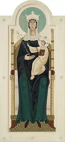 | Attributes | The Blessed Virgin Mary enthroned as Queen wearing a golden Saxon crown and golden slippers carrying the Child Jesus with the Gospel book and a Lily flower. |