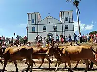 In October 1737, the Book of Deaths started to register deaths in Corumbá de Goiás, where the Chapel of Our Lady of Peñafrancia, inaugurated in 1734 and subordinated to the Rosary Parish, began to be attended by Father Antônio Soares.[1][9] The Chapel of Peñafrancia, elevated to the status of Mother Church in 1840, was the pioneer of the parishes of Abadiânia, Alexânia and Cocalzinho.[10][11][12] The Portuguese influence of the Our Lady of the Rosary Parish replicated the traditions of Pirenópolis in the Chapel of Peñafrancia in Corumbá, such as the Brotherhood of the Blessed Sacrament, Holy Week celebrations, Feast of Saint Sebastian, Feast of the Divine, Choir, Orchestra and band in the masses and processions, as well as the Cavalhadas, held in the city in September during the patron saint's feast.[9]
