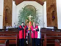 Nowadays, the celebration of the Palm Sunday, as well as the other celebrations, follow the rite promulgated by the Second Vatican Council, and begins at the windows of the Church of Our Lord of Bonfim. Upon arrival, the priest greets the people in the usual way, recites the prayers, and sprinkles the branches with holy water. The proclamation of the Gospel is made and then the procession is announced. At the beginning of the procession, immediately in front, goes the acolyte with the lighted thurible, and then, according to ancient local custom, the cruciferary, a Brother of the Blessed Sacrament with the ornamented cross; two Brothers leading the lanterns forming the wing of the faithful on the sides of the street in single line. In the center, the youth group of the Stations of the Cross Pastoral, followed by the guild of the Brotherhood of the Blessed Sacrament with the parish priest, accompanied by the Phoenix Band that performs the traditional dobrados and festive marches from its repertoire. When the priest arrives at the Mother Church, where the altar for the outdoor mass is located, he continues the celebration in the usual way, without the presence of the traditional choir and orchestra. On Palm Sunday evening and Holy Monday, the other celebrations of the Feast of the Steps take place.[42]