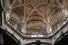 The cathedral plan takes the form of a Latin cross, the nave being flanked by slightly lower lateral aisles. It measures 84 m (276 ft) in length and 43 m (141 ft) across the transversal transept. Completed in 1505 by Rodrigo de Badajoz, the octagonal Gothic lantern tower with its three levels of windows rises above the point where the transept crosses the nave.[7] The former apse was later converted into an ambulatory bordered by a series of chapels including the 15th-century St John's Chapel (Capilla de San Juan) and the 16th-century Chapel of Snows (Capilla de las Nieves). After the chancel had been demolished in the 20th century, the choir stalls were moved into the body of the church and into Christ's Chapel.[8]