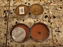 An outdoor candle,[1] which is also known a pitch torch or a garden candle[2] (Swedish: marschall, Danish: haveblus,[3] Finnish: soihtukynttilä) is a large (usually 10 cm wide) tealight-like candle that is lit outside. Outdoor candles are commonly found in Scandinavia,[4] and are used as an outdoor decoration in private gardens, graves or at the side of roads or paths. They are made from paraffin in a metal cup with a centimetre-thick wick, which heats up to 1000 °C. Due to this heat, and the fact that they are designed to be weatherproof, they have to be properly snuffed out with a snuffer.