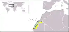 This map indicates the territory claimed by the Sahrawi Arab Democratic Republic, viz. Western Sahara (the lower half of the section shaded green). The majority of this territory is currently administered by Morocco; the remainder is named the Free Zone by the SADR, it is marked in yellow.