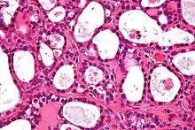 Ovarian clear-cell carcinoma often occurs as a pelvic mass that rarely appears bilaterally. The cells usually contain glycogen with large clear cytoplasm. It is also associated with endometriosis, a disorder of abnormal tissue growth outside of the uterus.[3] The tumor cells emerge in a stepwise manner from adenofibromas which are benign endometriotic cysts. They also hold molecular genetic mutations in both ARID1A and PIK3CA, similar to other epithelial ovarian cancers. Mutations in ARID1A commonly contain phosphatase and tensin homolog (PTEN) that are hypothesized to contribute to clear-cell tumorigenesis. However, research also shows that inactivation of ARID1A alone does not lead to tumor initiation. However, clear-cell tumors rarely carry p53, BRCA1, or BRCA2 mutations.[4] In addition, they also test negative for estrogen and progesterone receptors and Wilm tumor suppressor 1.[5] Studies have also suggested that clear-cell carcinoma can occur with thromboembolic complications and hypercalcemia. Recurrence of tumor cells have been reported to involve lymph nodes and parenchymal organs.