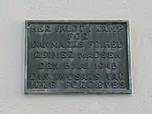 A bronze plaque on the facade of No. 45 commemorates the Aksel Hugo Reimer Madsen (1923-1945), a member of the Danish resistance movement, who was killed at the site on 5 May 1945. The inscription reads "Here died in combat / for / Denmark's independence / Reimer Madsen / on 5 May 1945 |your fight was / not in vain".[17]