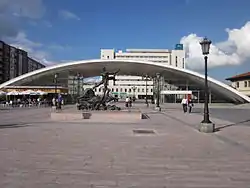While the main passenger terminal has not undergone major changes since the 1946 reconstruction, the platform area and the incoming railway tracks have since then been covered over by the imposing paved precinct, designed by Leonardo Fernández Troyano, which rests on 220 columns.[11] This covers an area of around 38,000 sq.m. and is about 700m across. It provides access to the station itself. The large plaza, known as Plaza de los Ferroviarios, is decorated with fountains and a variety of sculptures: Paz and Libertad ("Peace" and "Liberty"), by es:Luis Sanguino, and Hombre sobre delfín ("Man on a Dolphin"), by Salvador Dalí.[11] Facing the old building is another sculpture, Asturias, by es:José Noja.