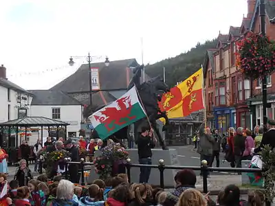 On 23 June 1400, the Eve of St John's Day, a young Oxford student, Rhisiart ab Owen, is travelling towards Wales.[22] He arrives at Dinas Bran Castle, high above Llangollen and just across the border from England, in a group that includes Walter Brut, a Lollard, and a group of monks led by the Abbot of Caerleon. Here he saves Mad Huw, who has preached that King Richard II of England is still alive, and a girl called Tegolin from being burned at the stake. Rhisiart and his fellow travellers then proceed to Owen’s stronghold at nearby Glyndyfrdwy, along with Owen Glendower's son Meredith.